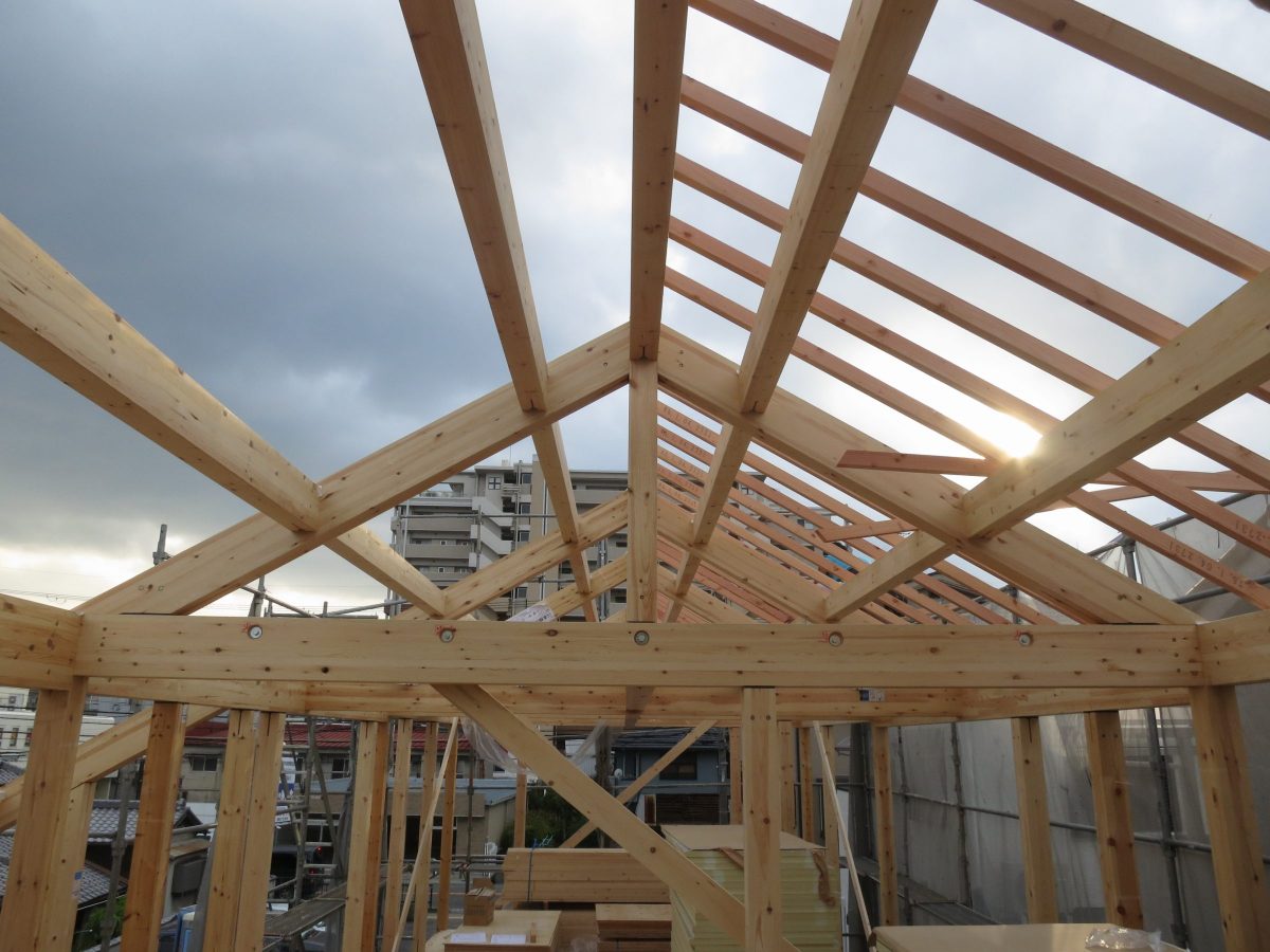 台風の影響で職人や資材手配に難航しましたが、本日棟上げを行いました。