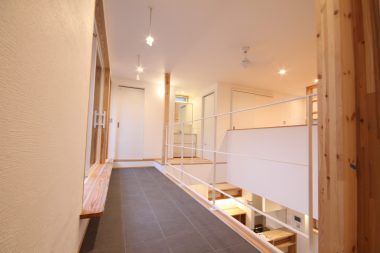 2.日向ぼっこができるスペースは、吹抜けがもっとも暖かくて気持ちのいい場所ですので、吹抜けの外壁側に通路を作り且つバルコニーでプライバシーを高めた空間を提案しました。