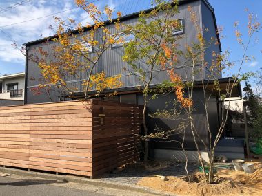十分なゆとりを作る玄関・アプローチ、南道路面の足元には植物を配した約2Mの高さのウッドフェンスで