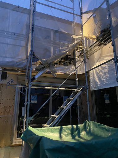 夕方に足場シートや雨養生シートを外し