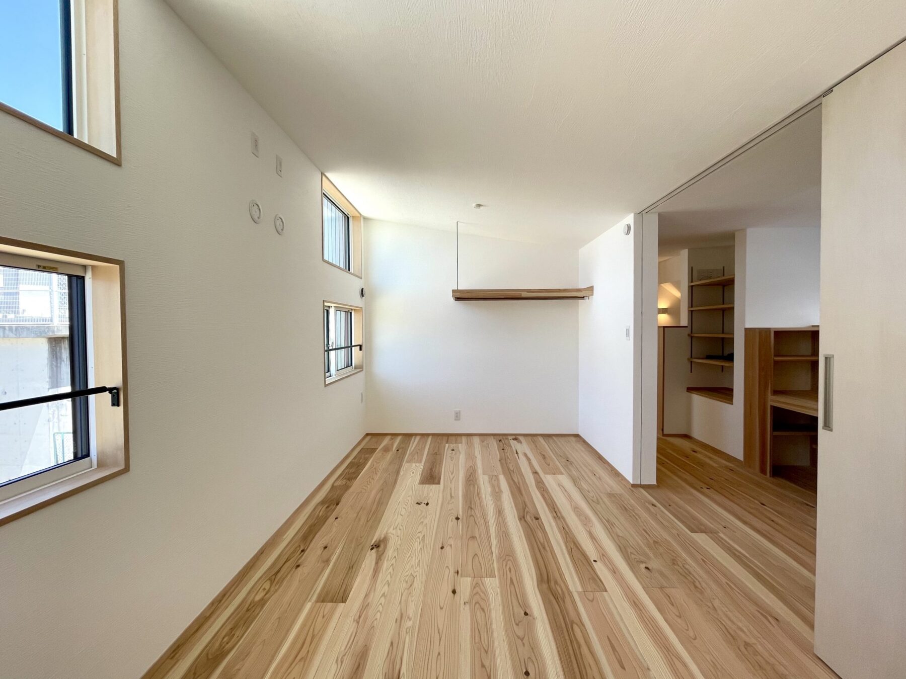 廊下を兼ねるため幅は1間とゆったり設け、さらに子供室の2枚引込み戸を開け放つことで、