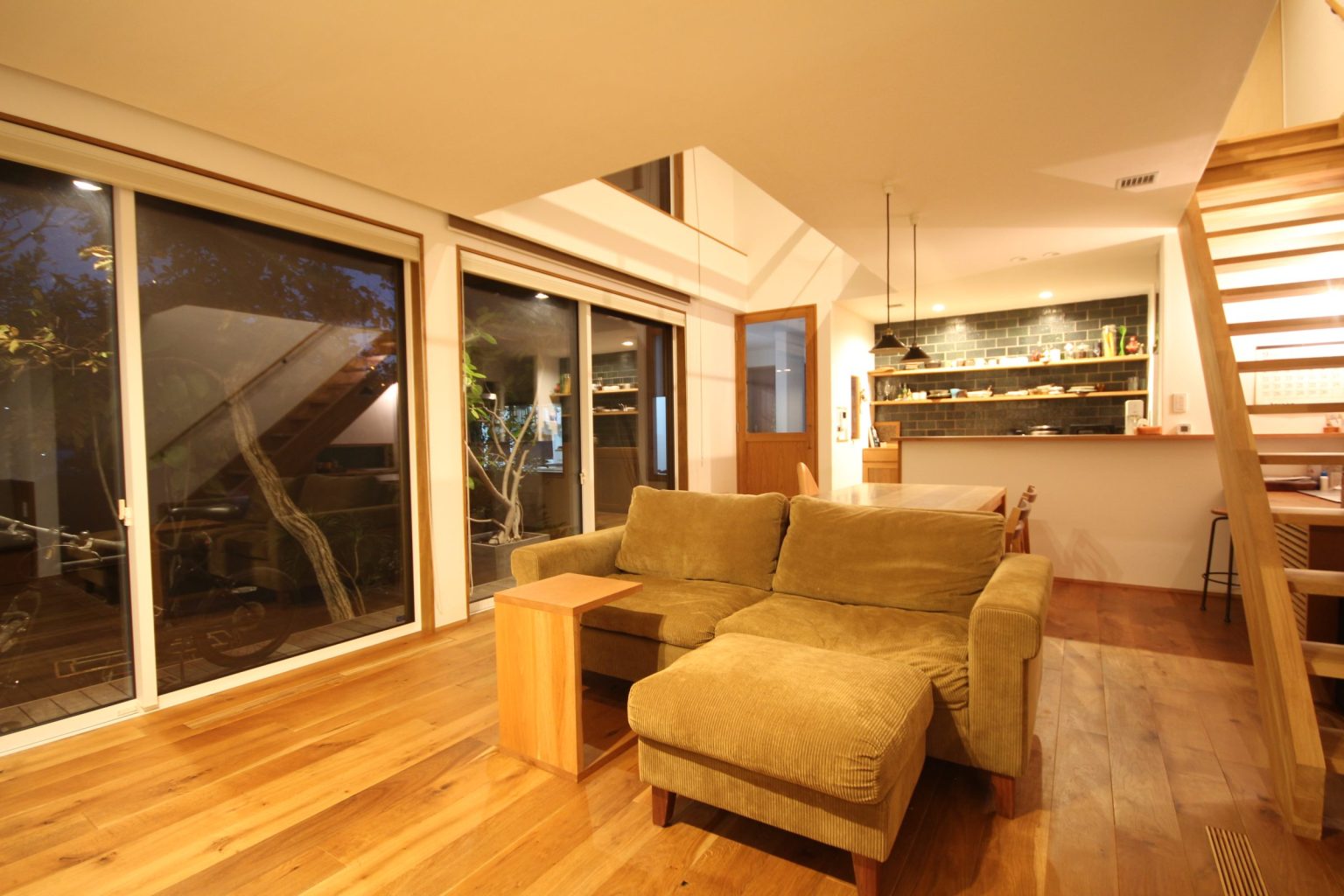 日中の、木漏れ日のある様子とはまた違う、落ち着いた雰囲気のリビングです。