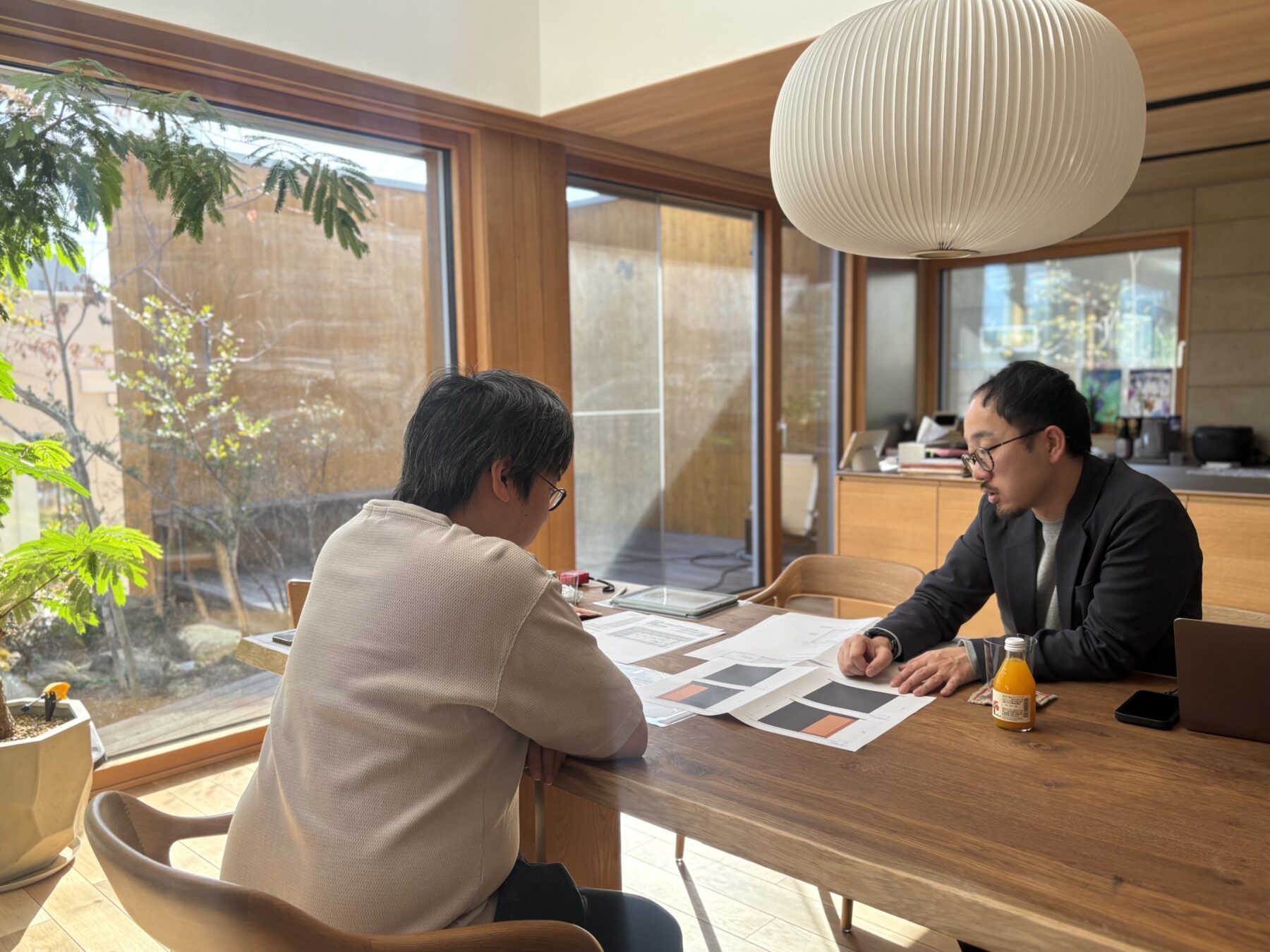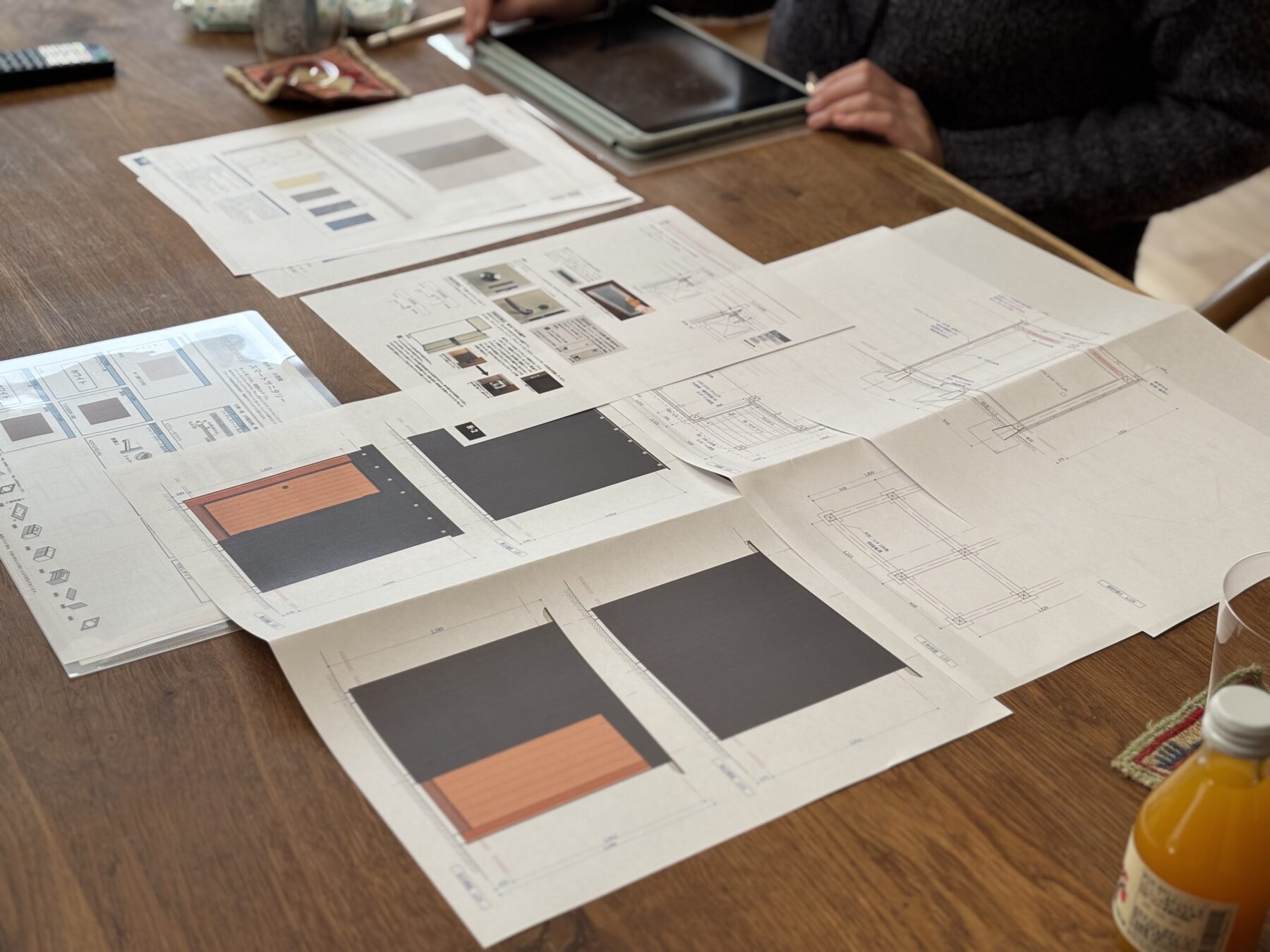 今回は、詳細図を作成し、実際の寸法感や納まりについて、KN様・田中部長と一緒に確認を行いました。