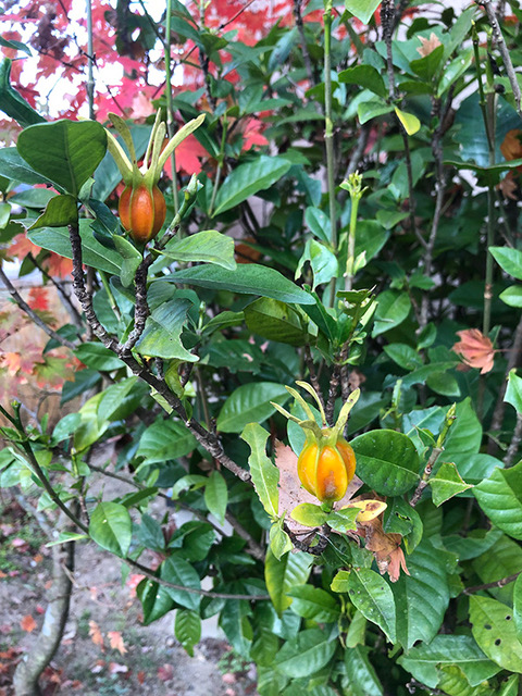 このクチナシ、花の甘い香りだけでなく10~12月に熟す果実は、長さ2~3cm、先端にがく片が残 るかわいらしい形をしています。「口無し」という名前は、果実が熟しても口を開かないことから つきました。また、将棋盤の足がクチナシの実をかたどっているのは、第三者の口出しを戒める 意味があるそうです。