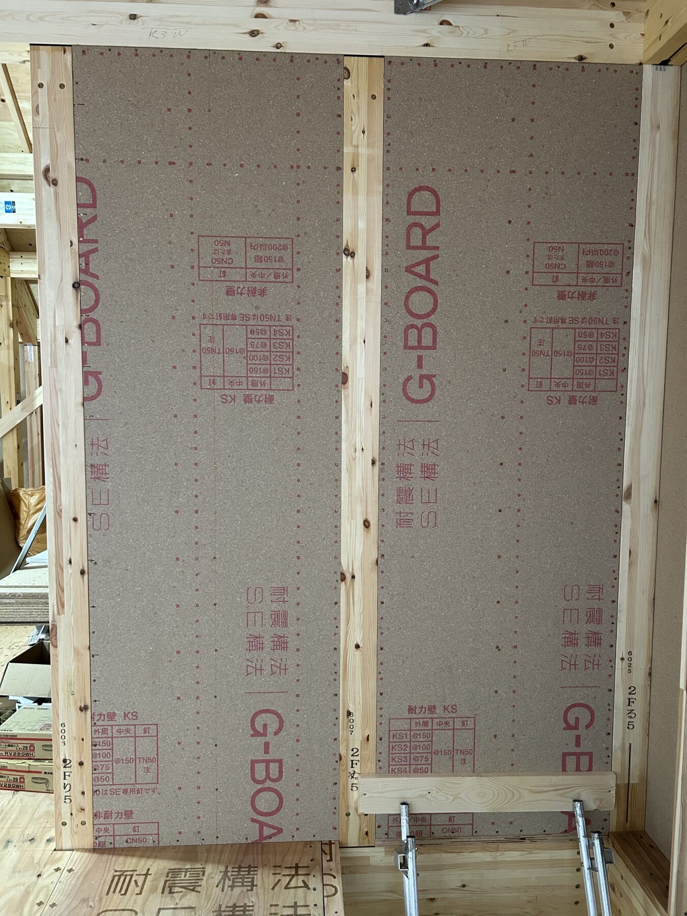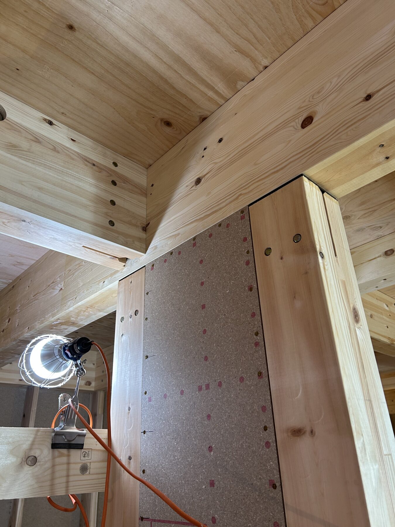 細かな事ですが、これまでは構造を現しにする場合、ピンを打ち込む向きを揃えるよう指示を出していましたが、やはり慌ただしい建て方の最中ですので、そこまで気が回らない場面もあり、後日打ち直すこともありました。
