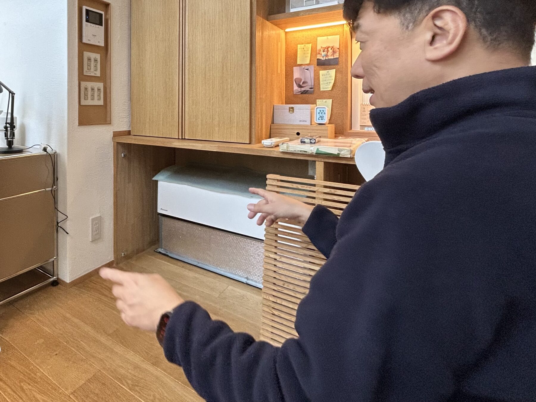 ▲こちらがエアコンの本体。木ルーバーをどかした奥にあり、普段は見えない状態です。