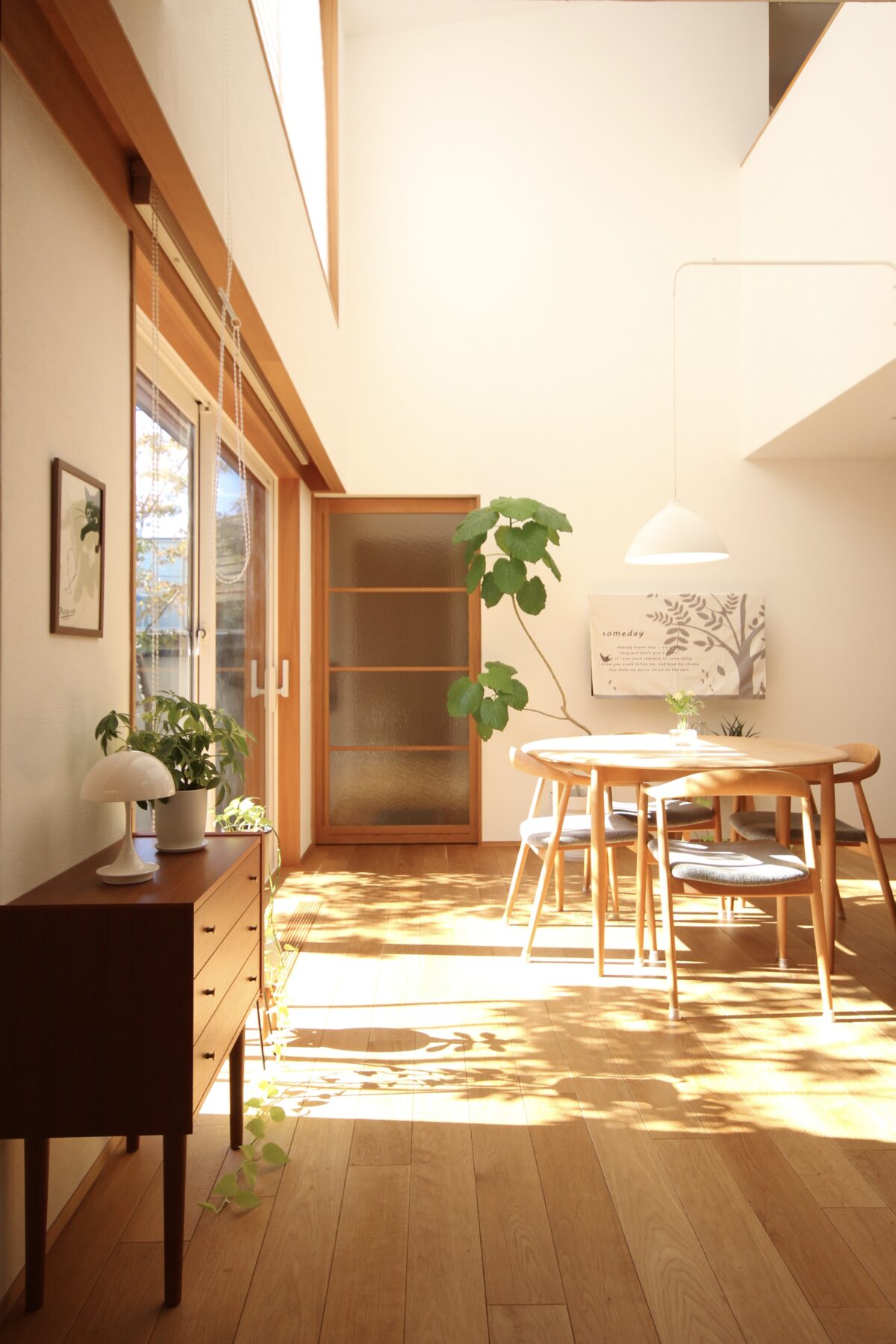 ダイニングの吹き抜けには上下に開口部が設けられおり、照明の必要がないほど明るく暖かい光が降り注ぎます。