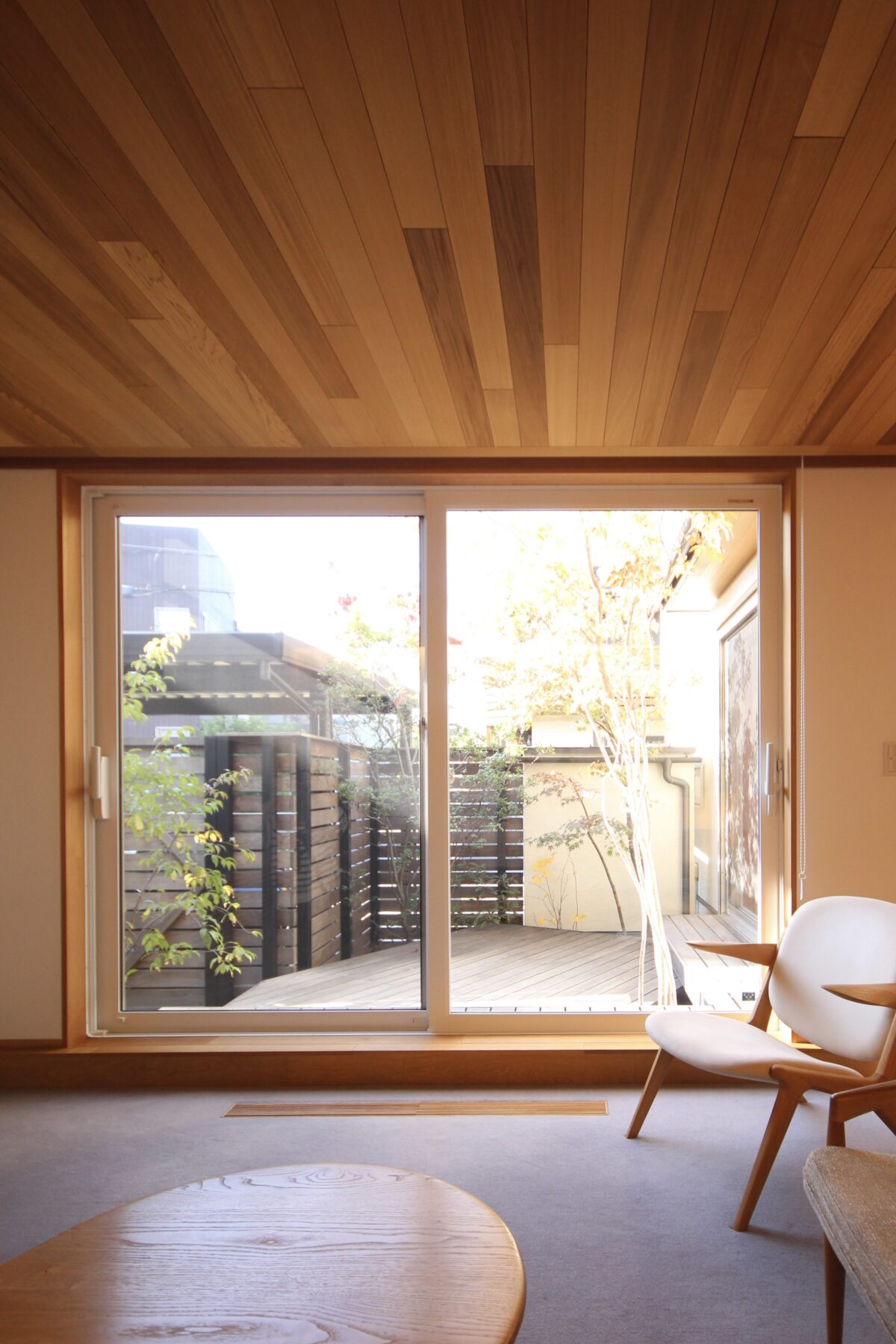 床をカーペット仕上げ、天井を板貼とすることで落ち着いた上質な空間を演出します。造作ソファに座ると、自分だけの中庭の緑を楽しむことができます。