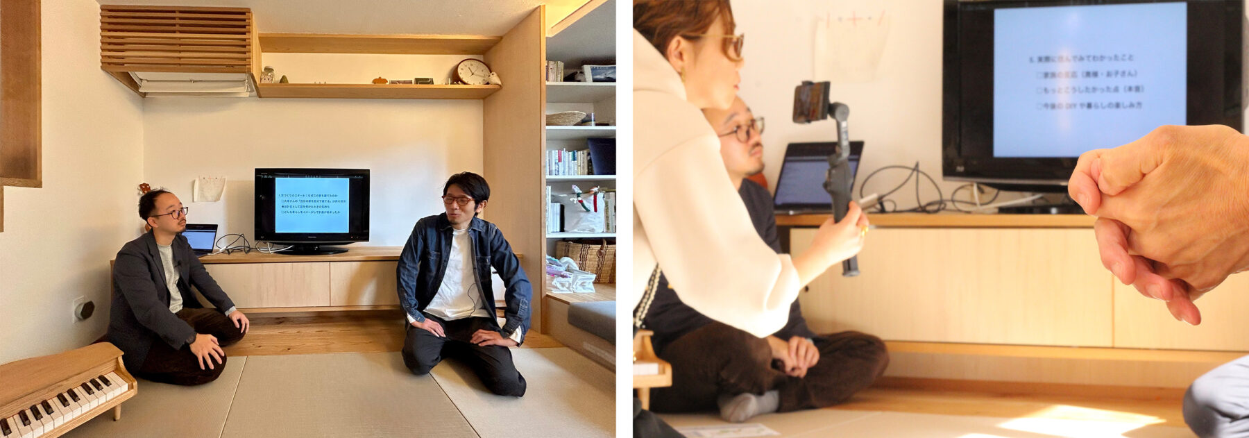 家づくりを始めた頃から現在に至るまでを画面にテーマを映し出しながら質問形式で田中・大塚コンビがざっくばらんに語らいます。
