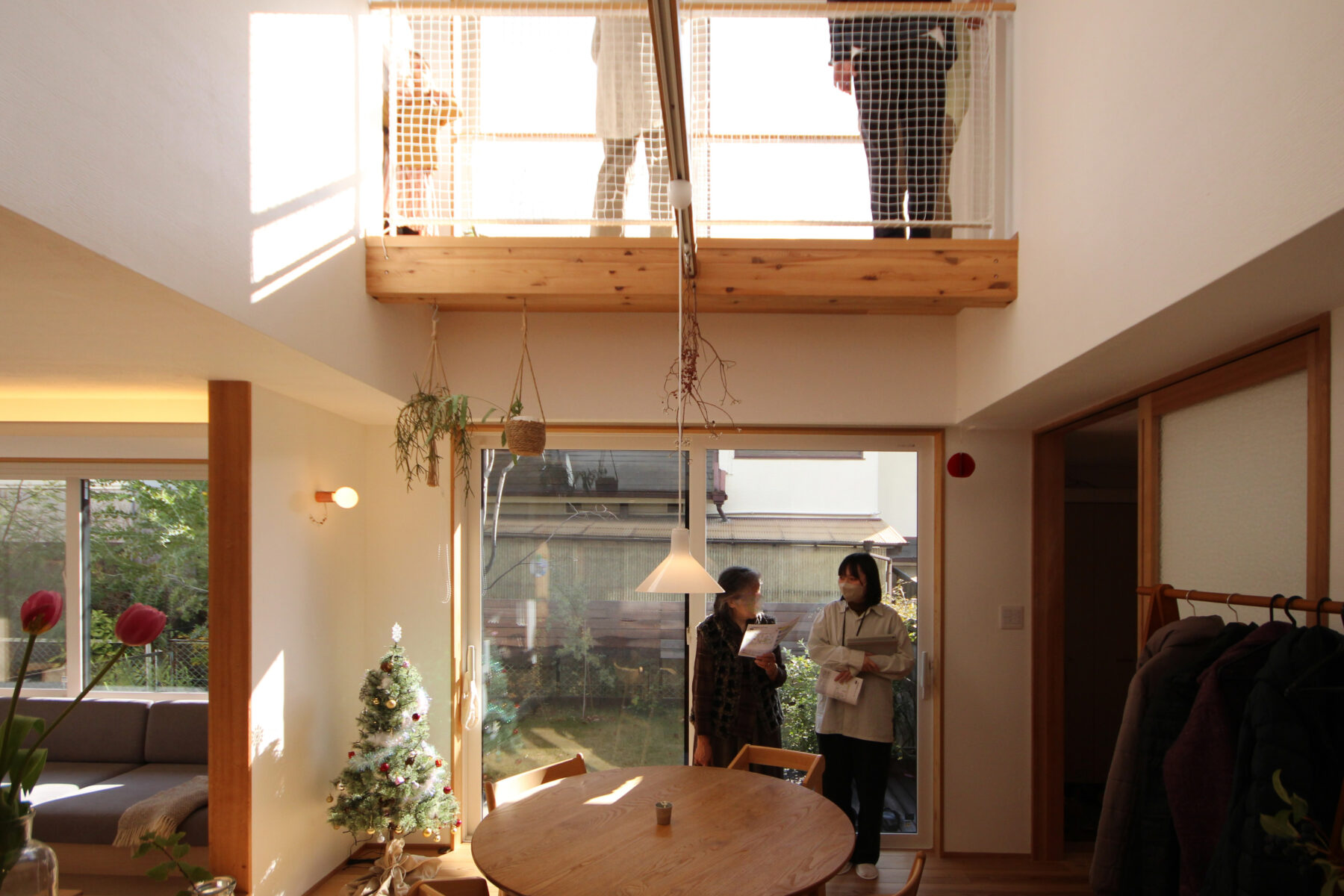日射取得の要となる吹抜に設置した掃き出し窓にキャットウォークを設けることで、開閉を可能にし多用途な空間に。