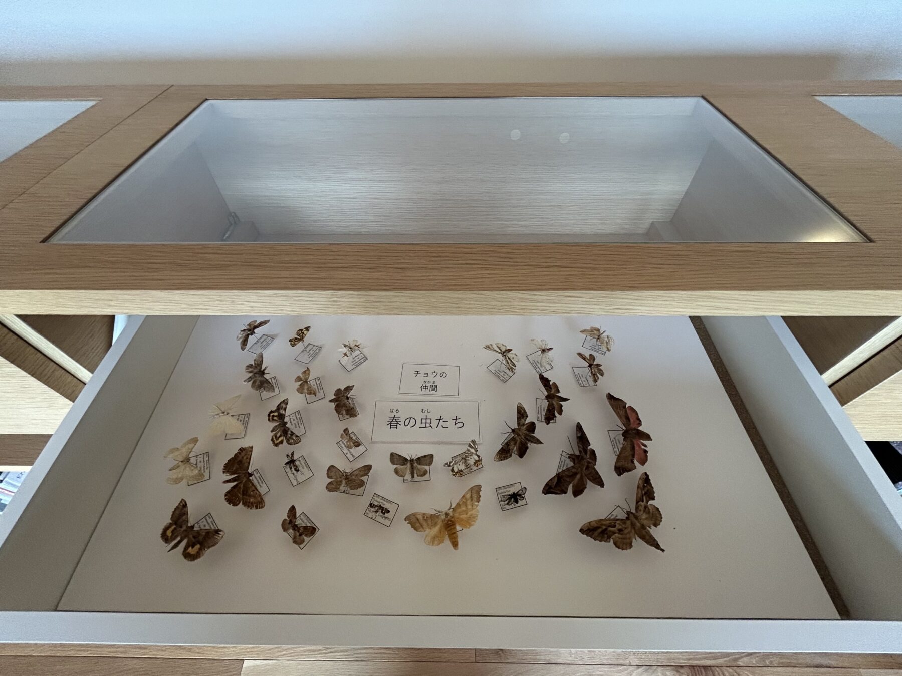 ▲2階の美しい板張り天井と奥さまが採集された昆虫標本用の造作ショーケース
