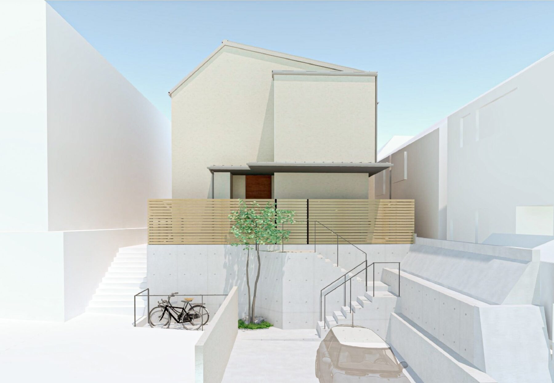 もともと公園だった敷地を3区画に分けたうちの一つ。斜面地のため造成工事が必要であり、さらに他の区画との整合を図りながら計画を進める必要がありました。約1 年にわたる調整を経て、ようやく許認可が下り工事がスタート。