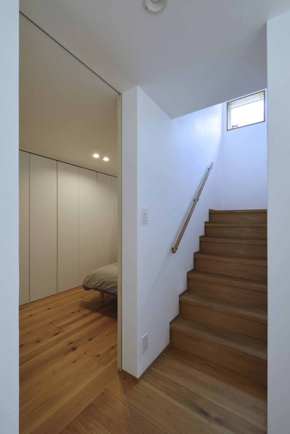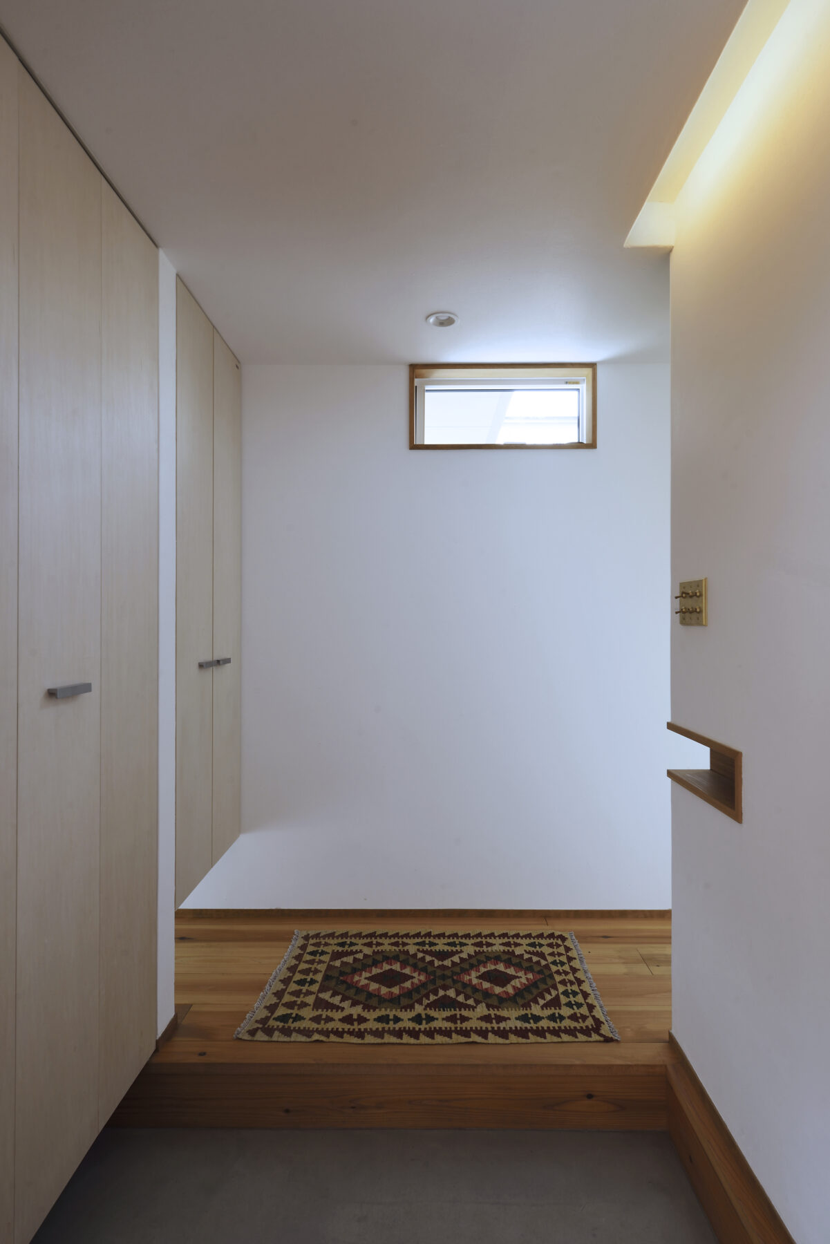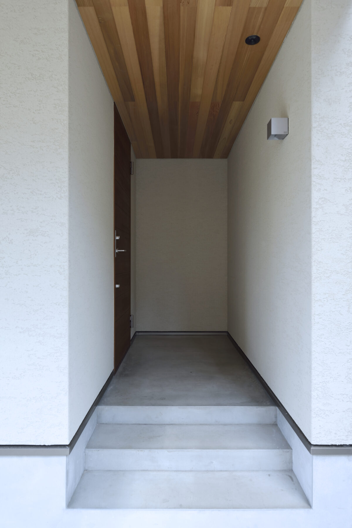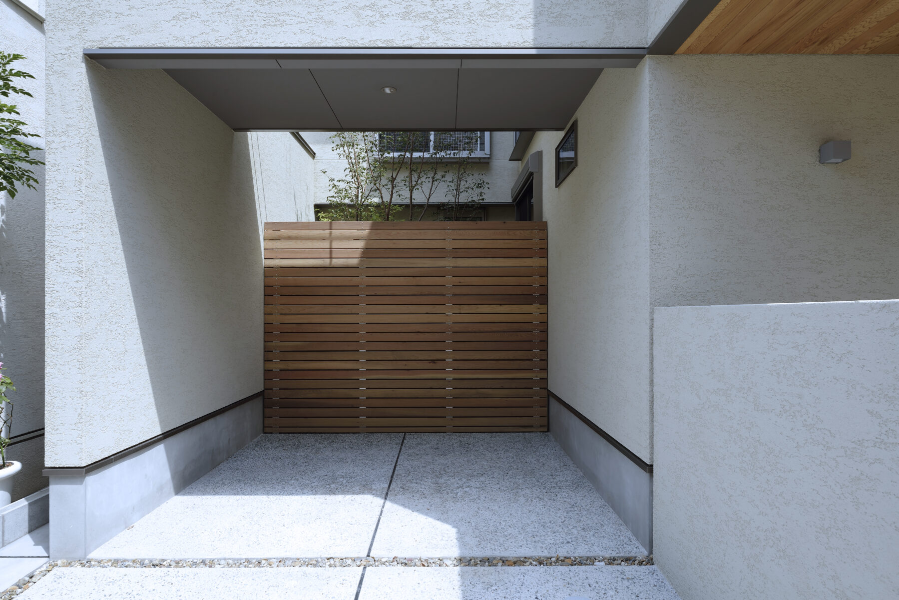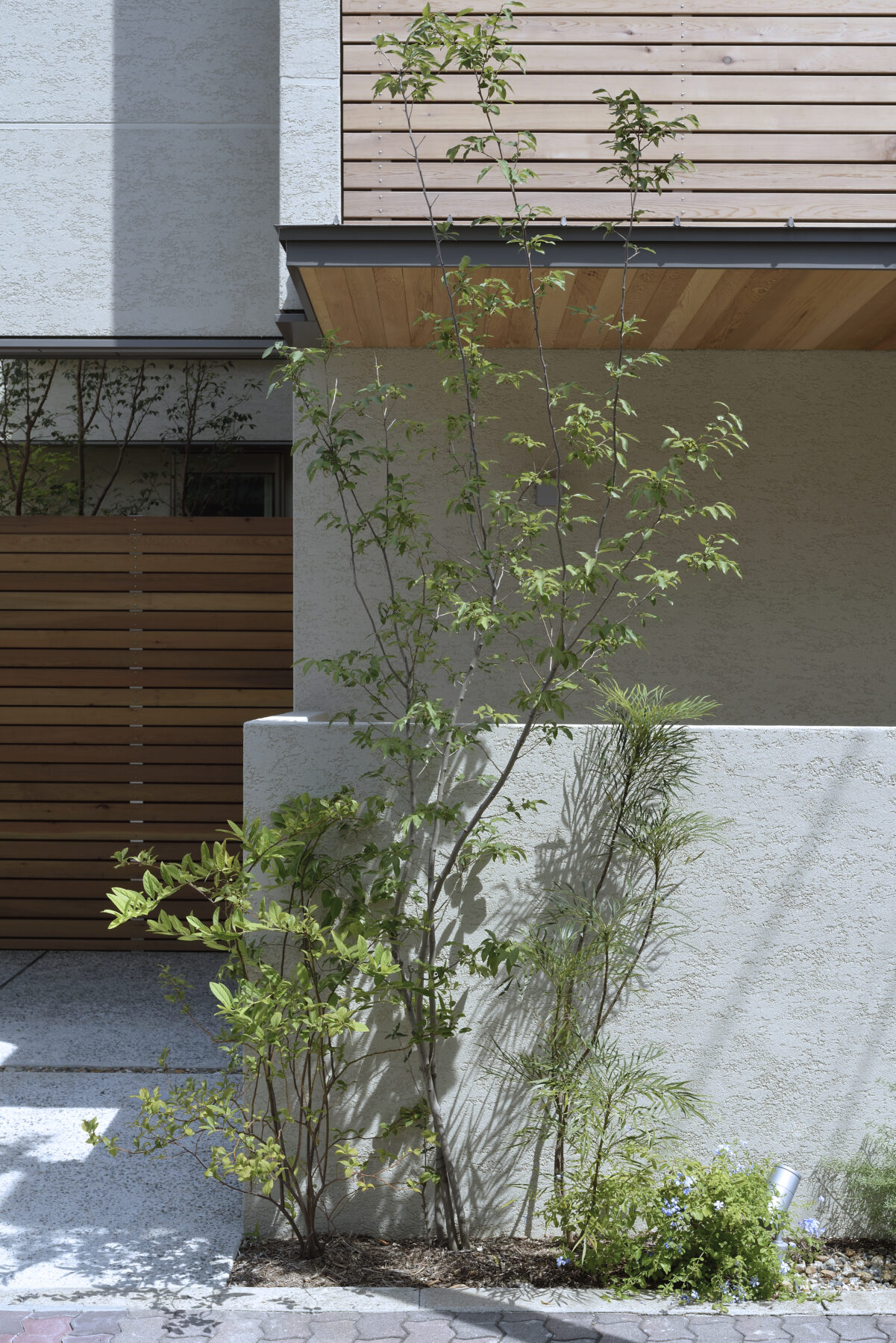 都市の限られた敷地に合わせた大阪市の都市型住宅。 道路に面しながらも壁と植栽で柔らかく視線を受け止め、奥にビルトインガレージを計画。 コンパクトながらも奥行きのある構成で、街中でも落ち着いて暮らせる住まいを目指す。