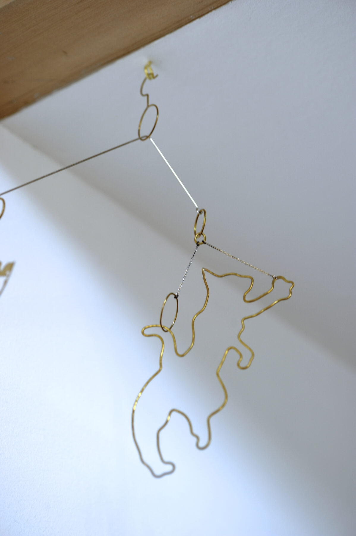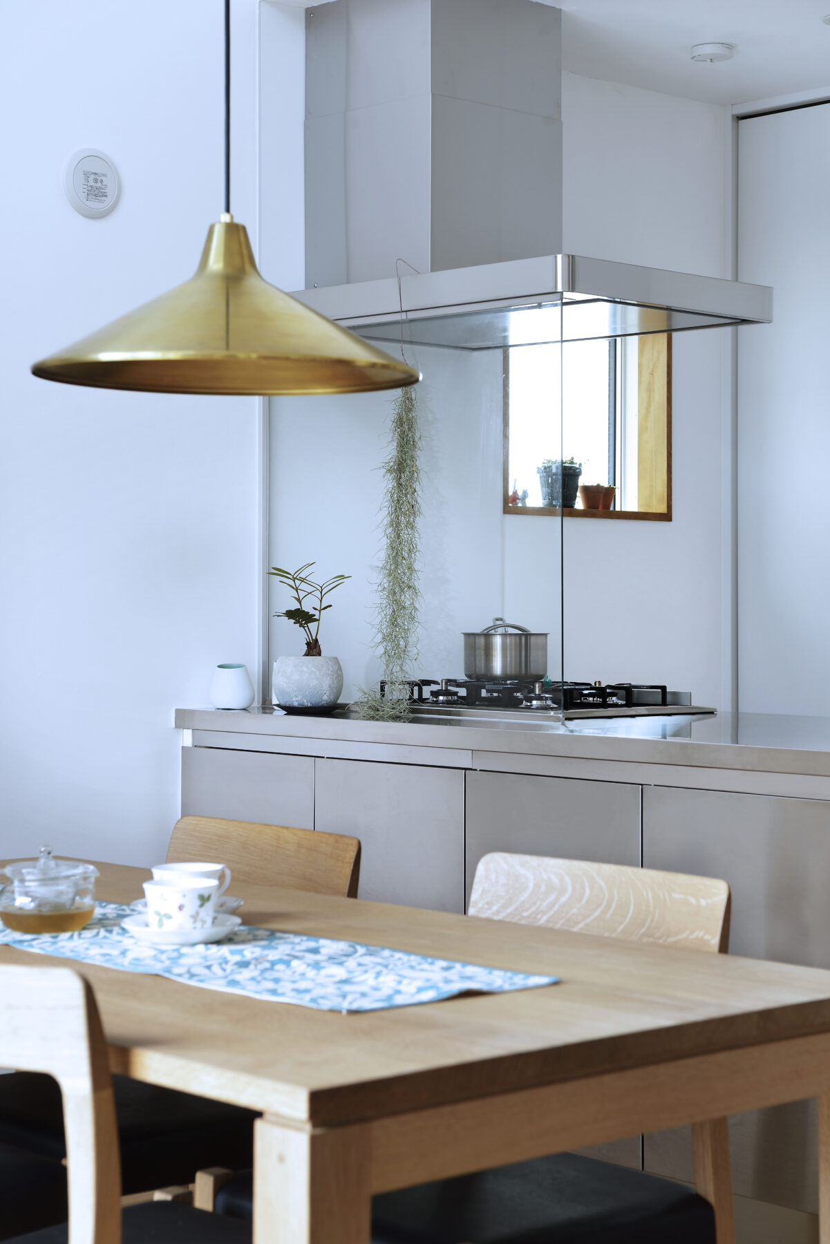ダイニングには MASTERWAL(マスターウォール)のオーク材テーブルと椅子を採用。床と同じオーク材を用いることで、空間全体に温かみと統一感をもたせている。照明は持ち出し式とし、芦屋市の照明ブランド flameの真鍮ペンダントを選定。経年で深みを増す素材感が、食卓に落ち着いた雰囲気に。