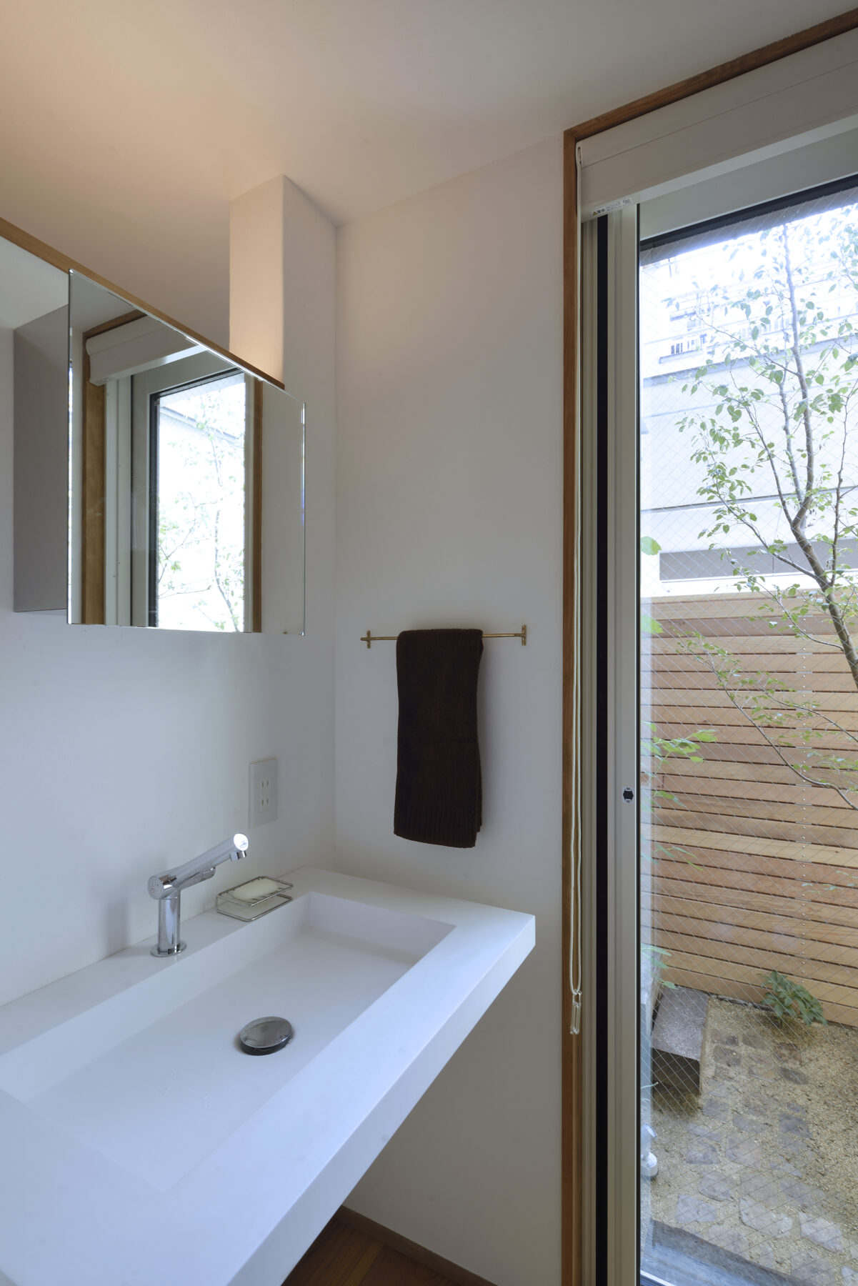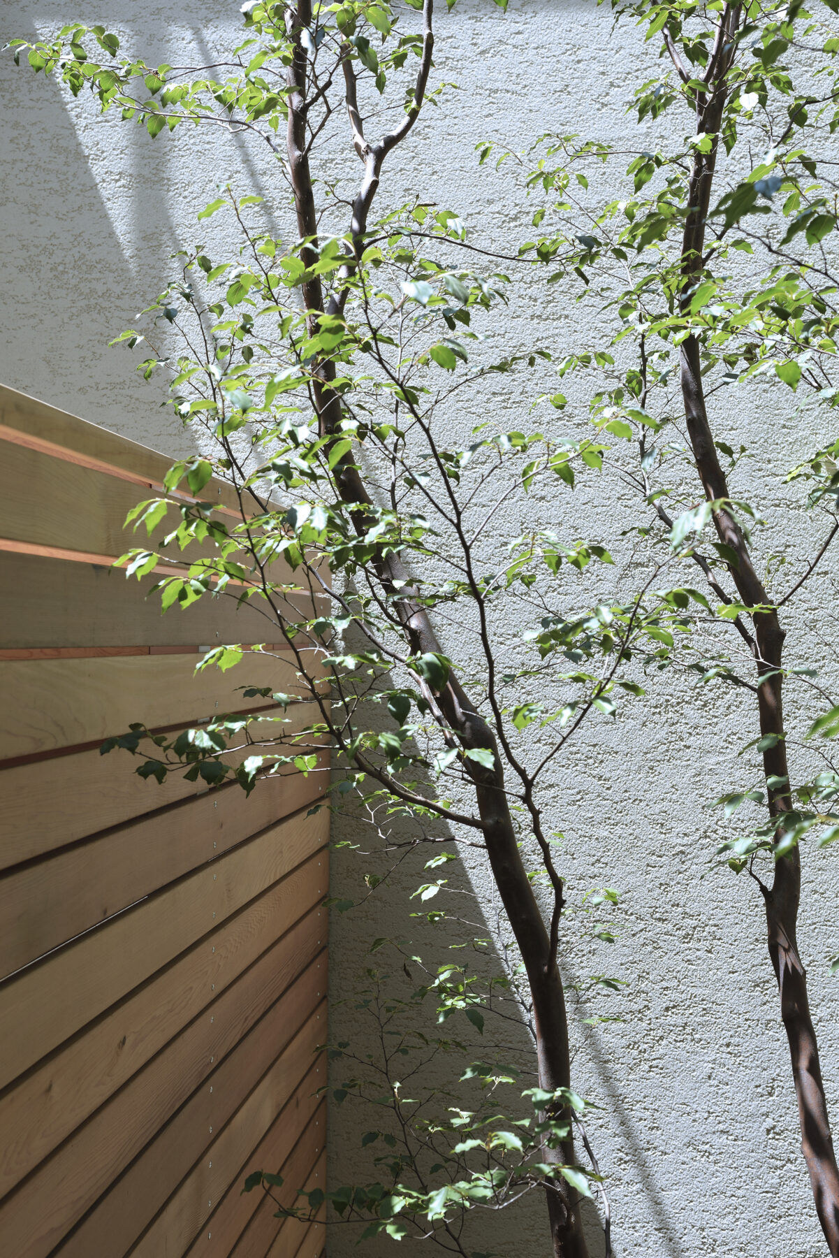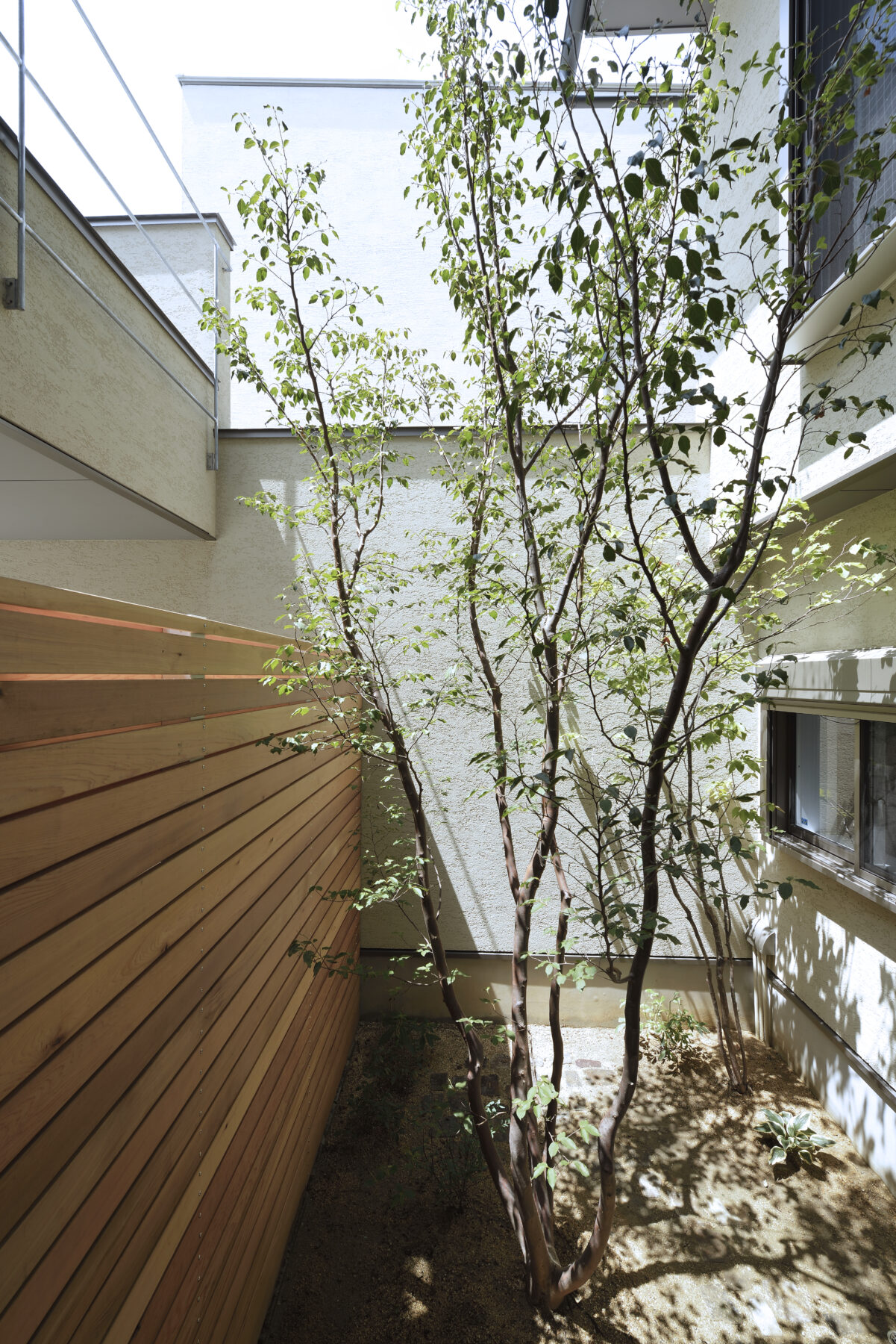 ビルトインガレージの奥に中庭を設け、住まいの中心に光と緑を取り込む。 車を降りた瞬間から中庭越しに自然を感じられる、都市の中でも心地よい暮らしを描く。
