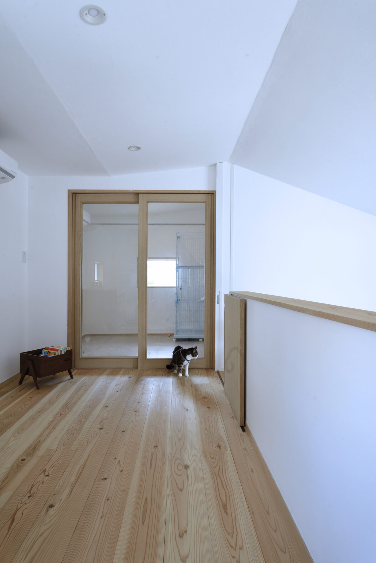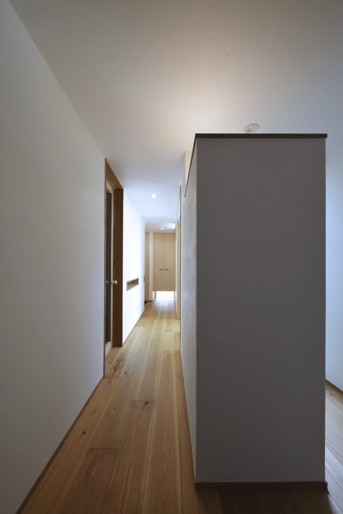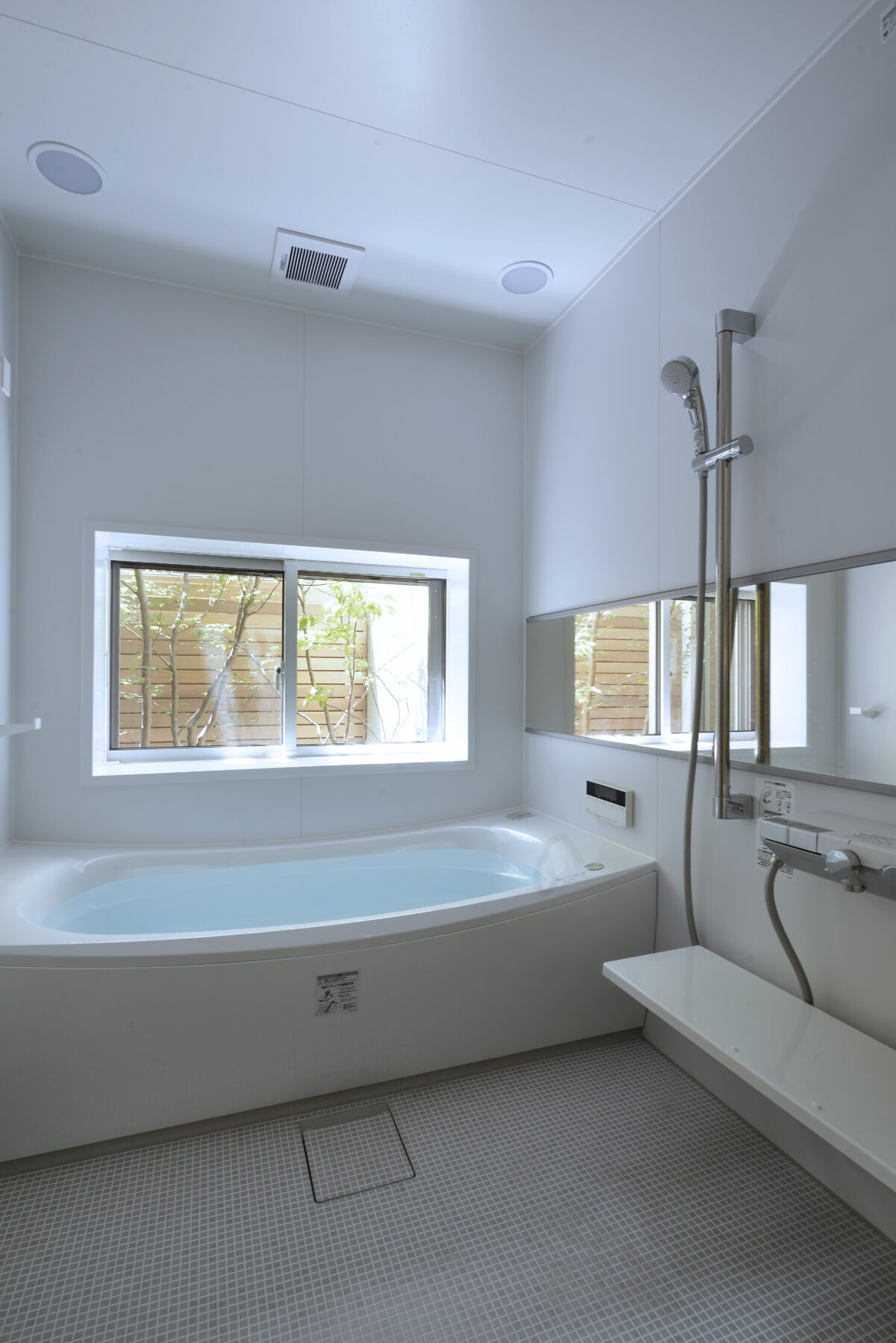 ビルトインガレージの奥に中庭を設け、住まいの中心に光と緑を取り込む。 車を降りた瞬間から中庭越しに自然を感じられる、都市の中でも心地よい暮らしを描く。