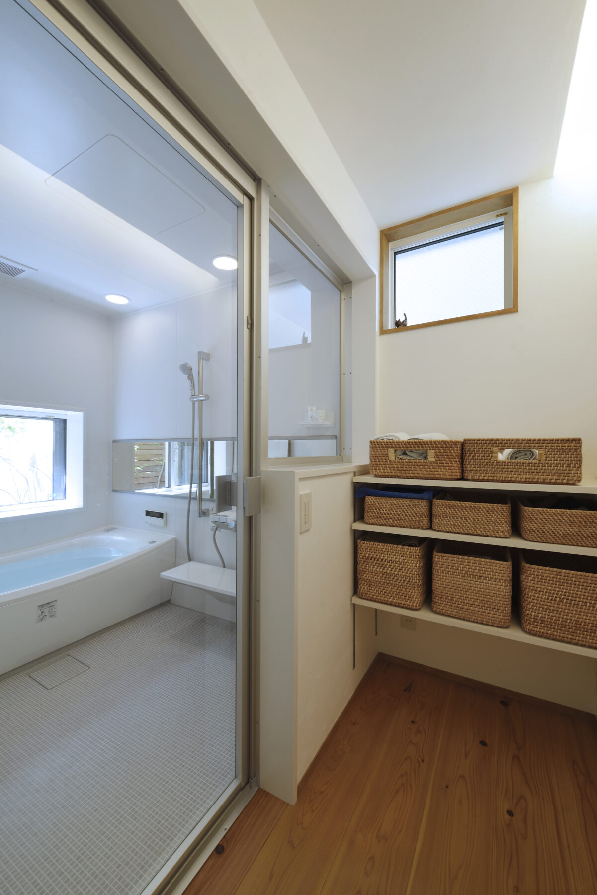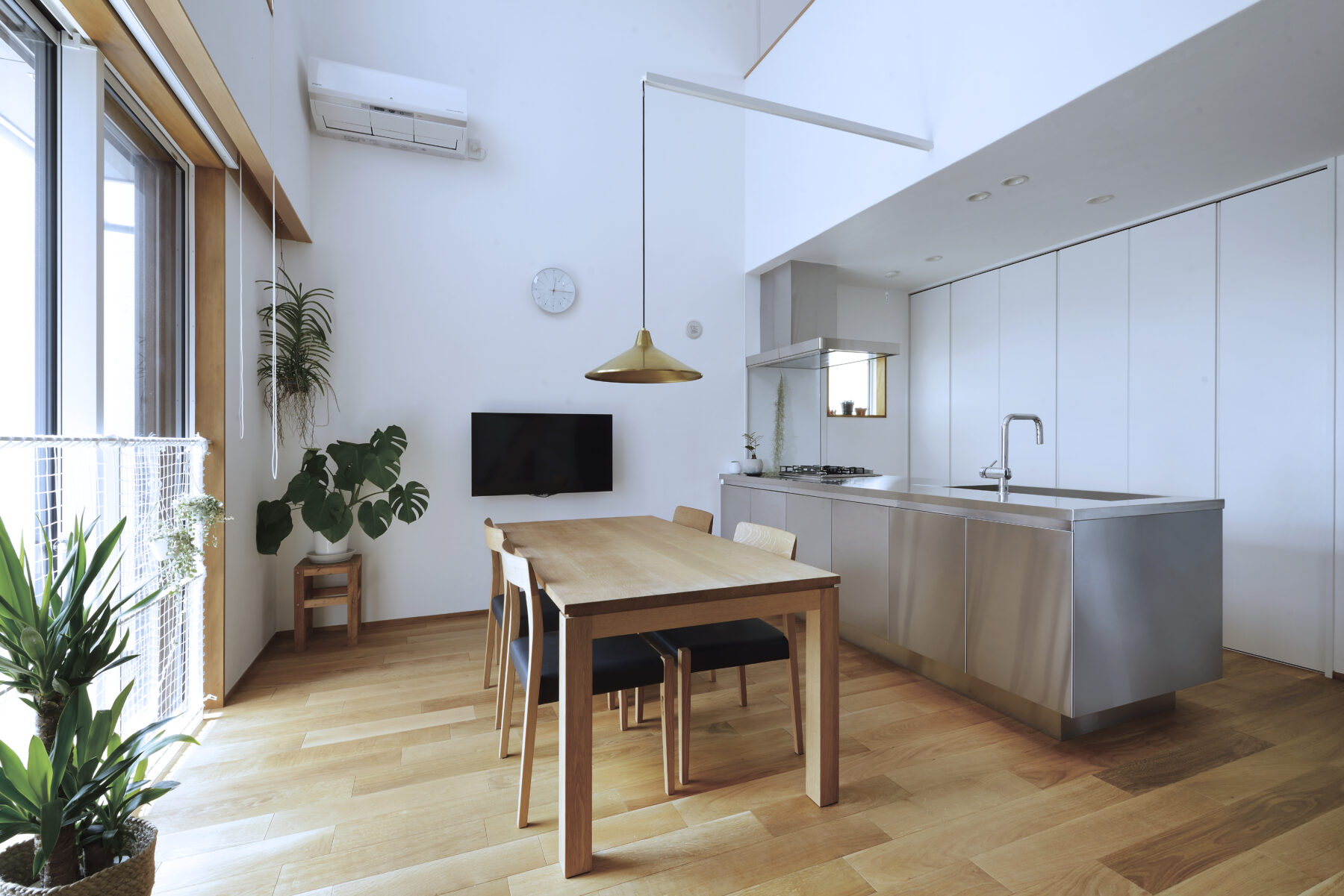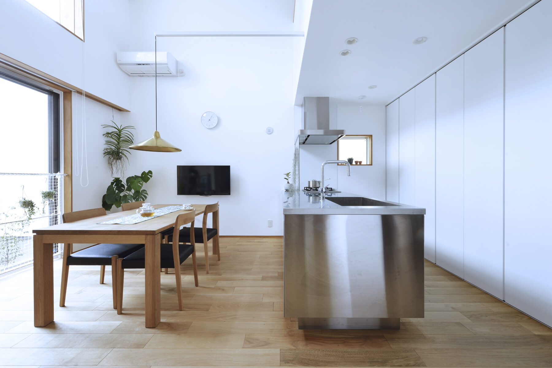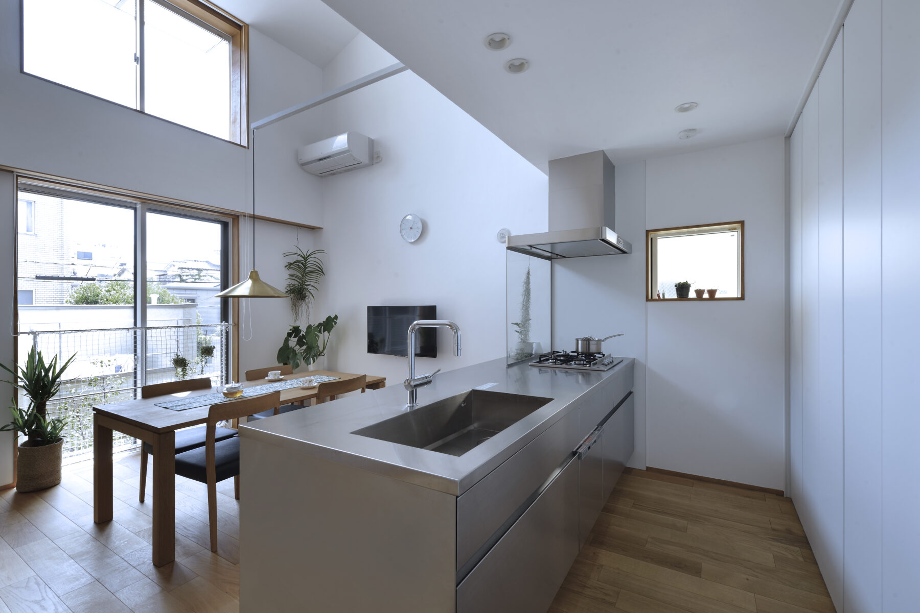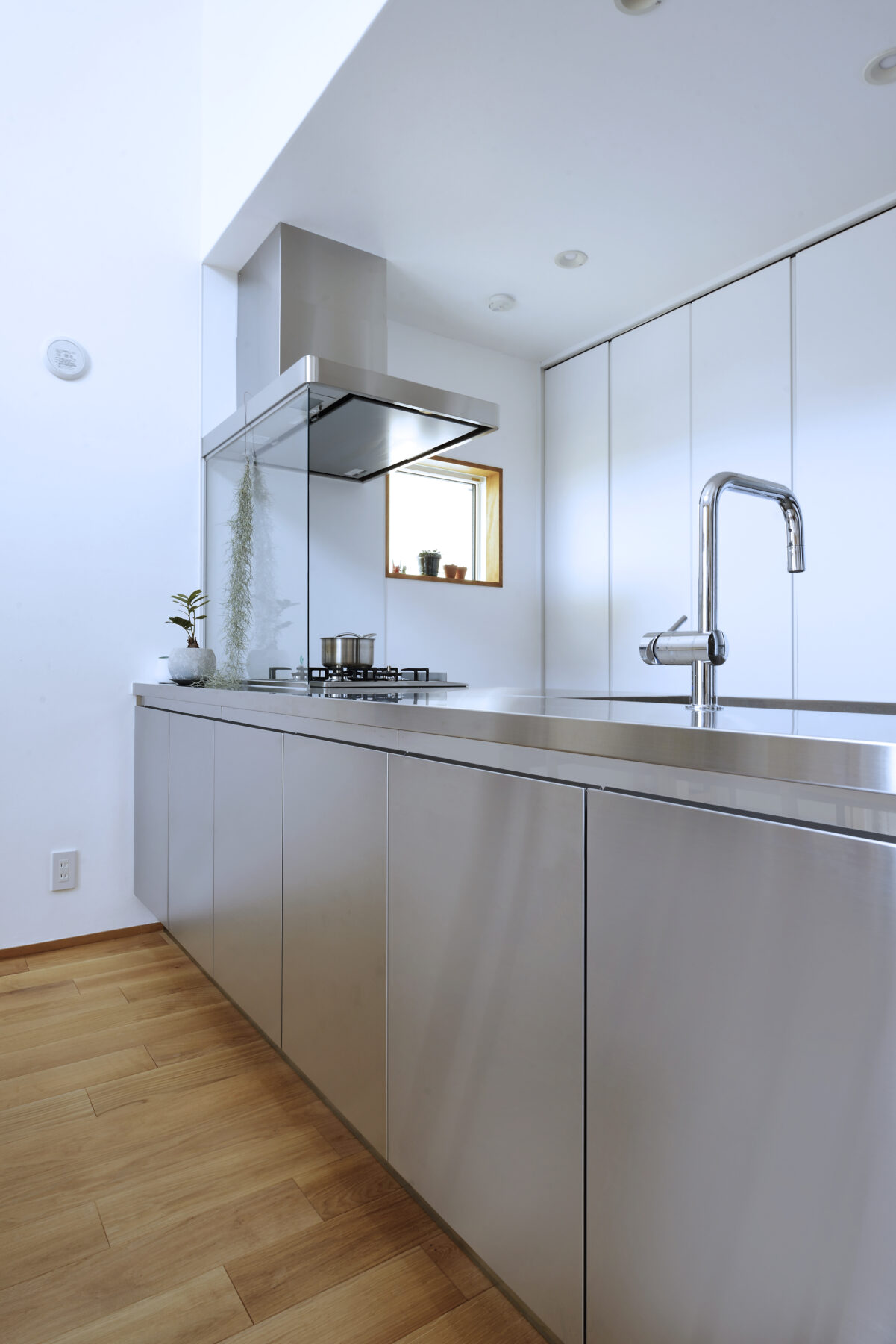 キッチンは永大産業のステンレスを採用し、シャープで清潔感のある空間に仕上げた。吹き抜け上部の大きな窓はパッシブデザインの設計手法に基づき、冬の日射をしっかりと取り込む。料理をしながら家族の姿を見守り、季節の光を感じられる、日々の暮らしを豊かにするキッチンで。