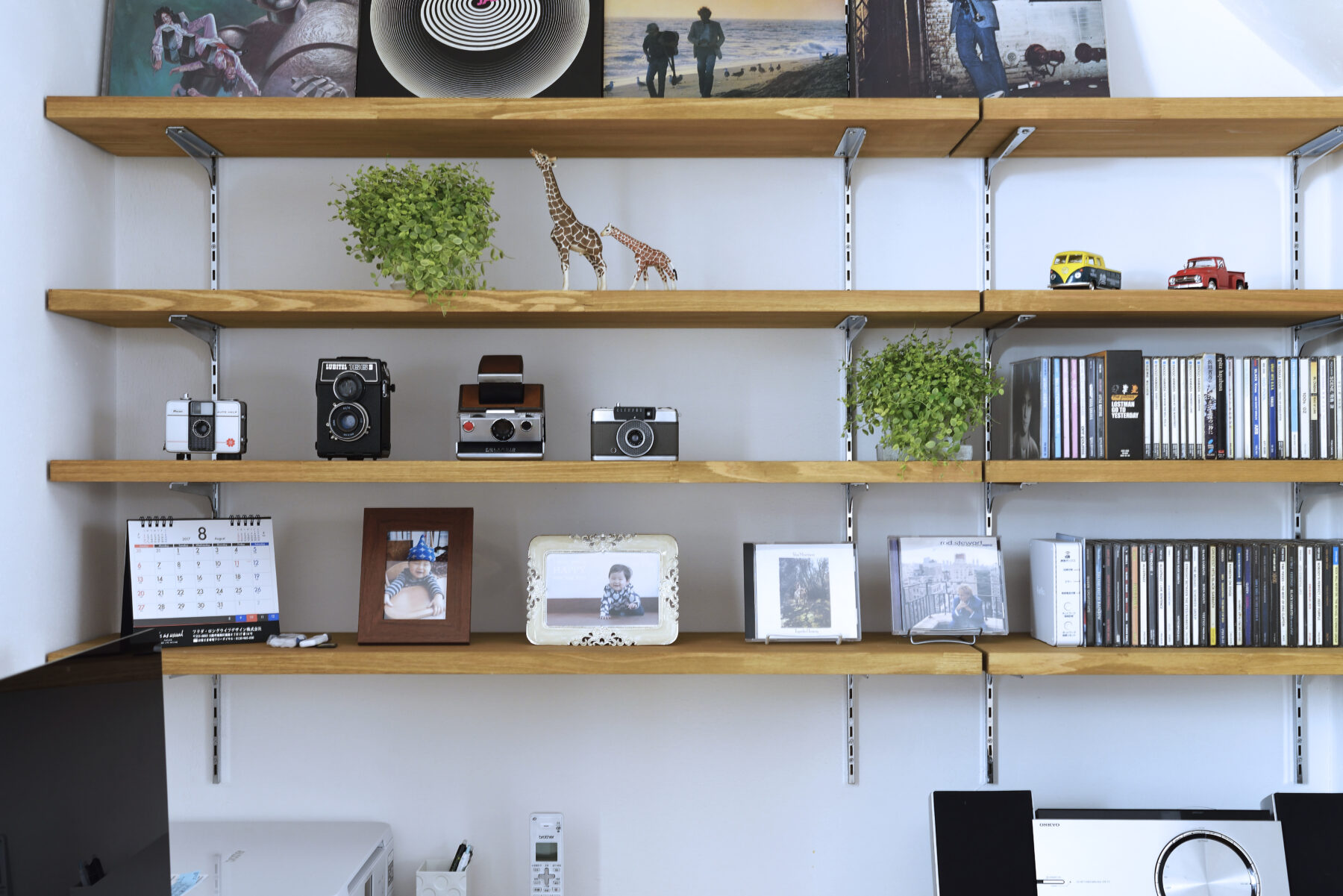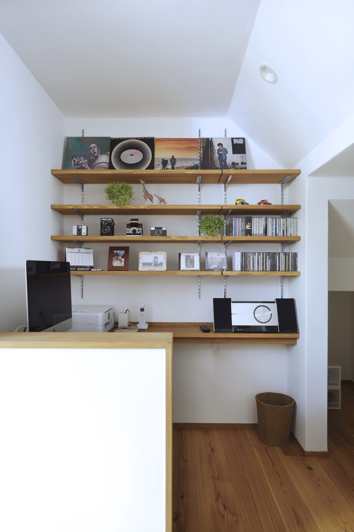 ご主人様の寝室の一角に設けたワークスペース。壁一面の棚にはお気に入りのカメラや音楽、思い出の写真が並び、趣味と日常が心地よく重なる自分だけの空間に。