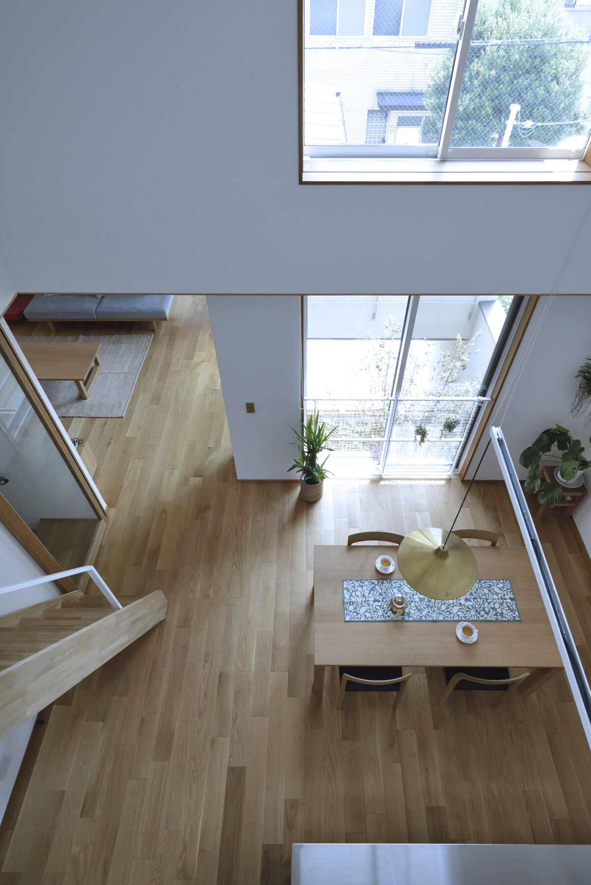 ロフトから見下ろすと、吹き抜けを通してダイニングやリビングが一体につながり、家族の気配をどこにいても感じられる空間構成に。