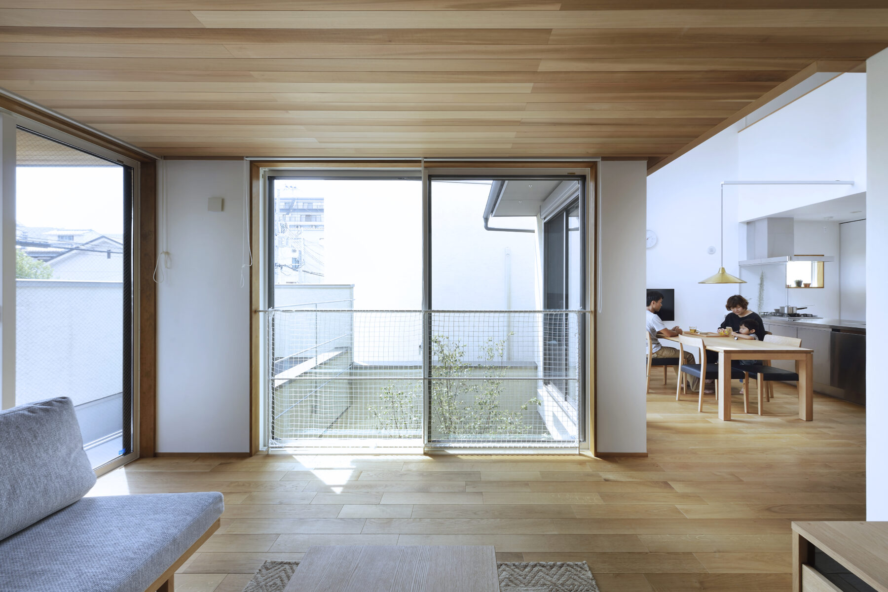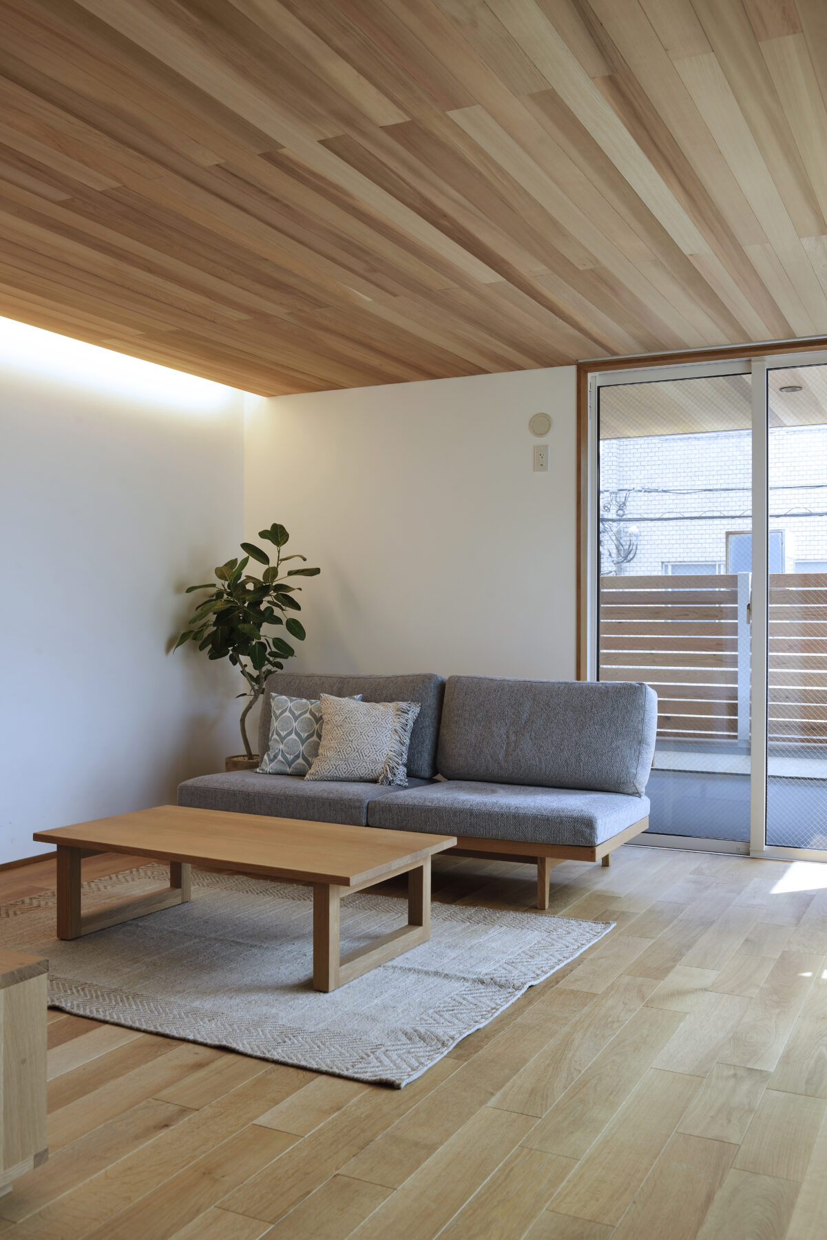 2階リビングは光と風を取り込みやすいパッシブデザインの設計手法を採用。1階の中庭の植栽が視線に重なり、家族が食卓を囲んだり、ソファでくつろいだりしながらも、自然とつながる庭を感じられる心地よい暮らしを実現。