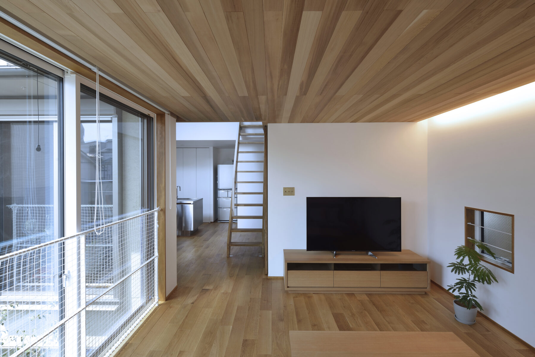 リビングはあえて天井を低く抑え、隣接するダイニングを吹き抜けにすることで空間に高低差を。 その対比によりリビングは包まれるような落ち着きを感じられる場となり、家族が自然と集まる心地よい居場所に。